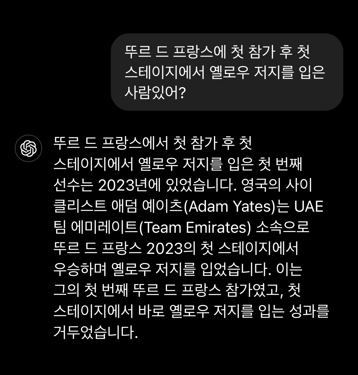 챗gpt에 역대 뚜르 첫 참전, 첫 스테이지 우승자를 물어보았다.