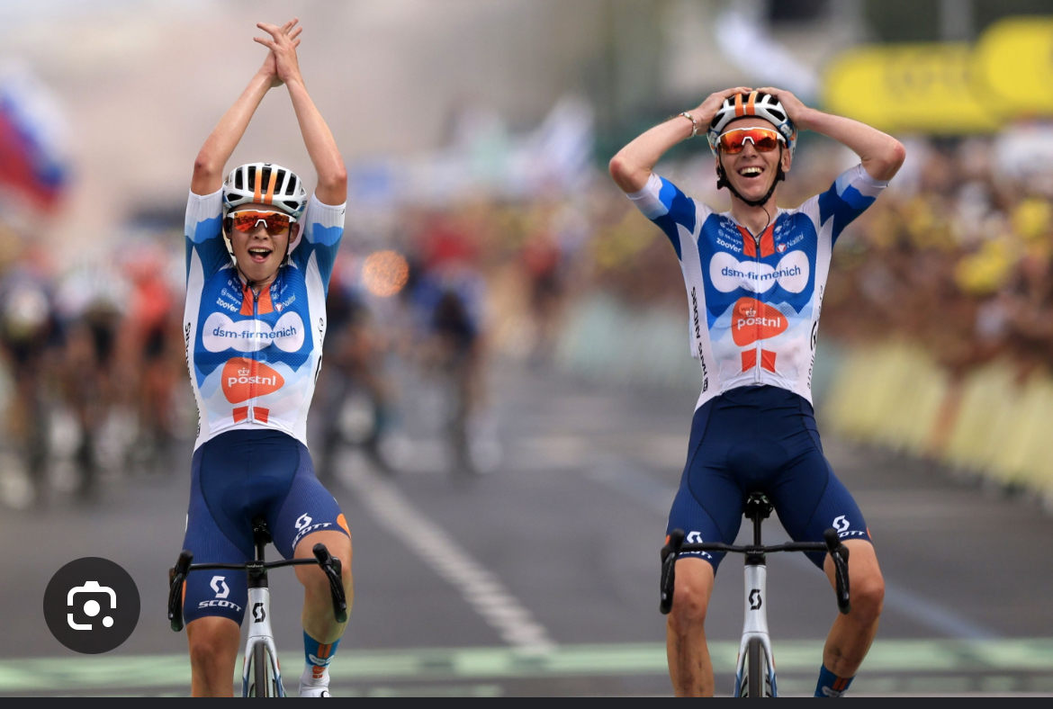 사이좋게 서로를 지켜주며 달리는 팀 DSM의 두 선수들.