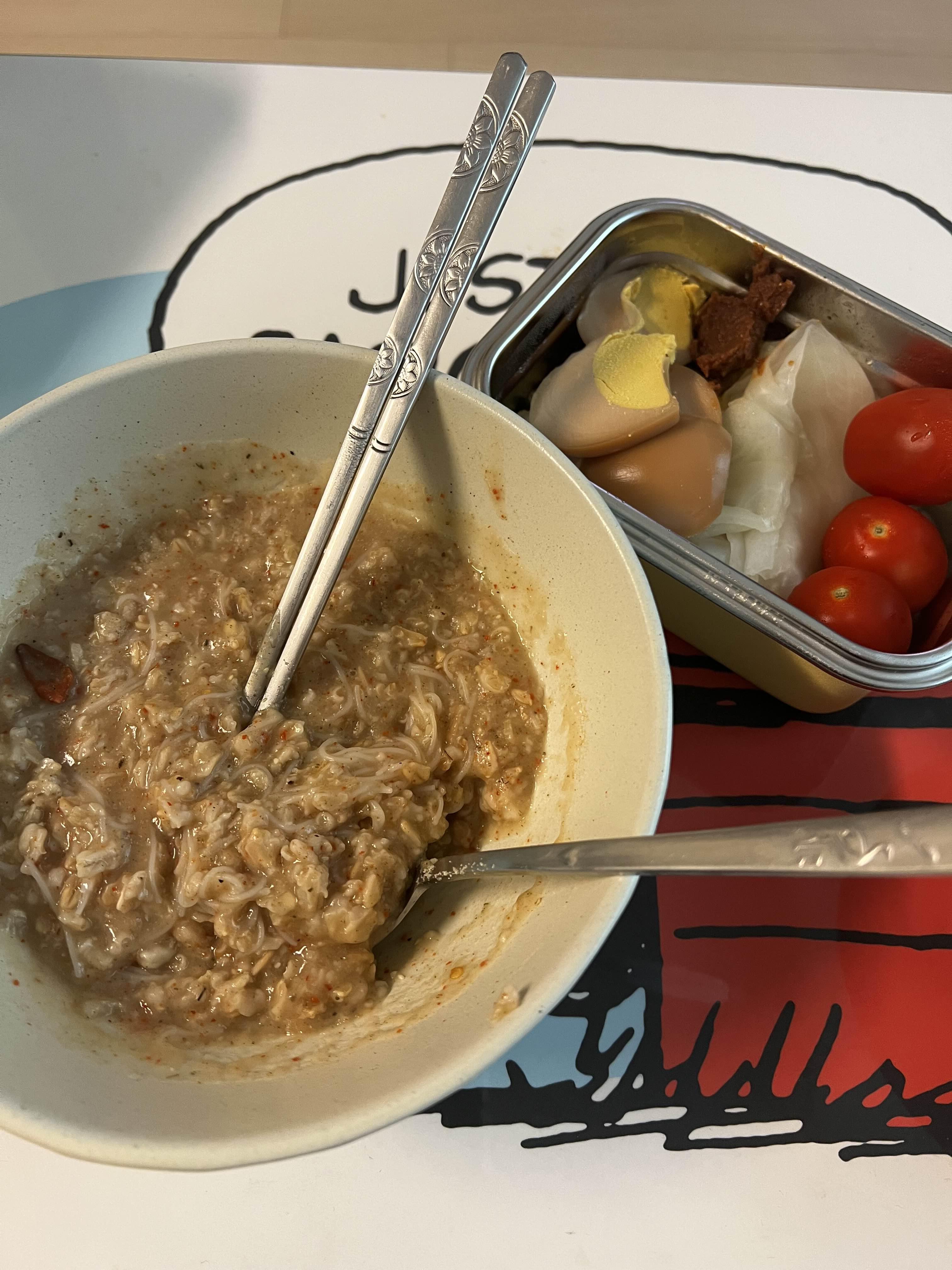 홀린듯이 유튜브 라면 레시피들을 보다가, 제멋대로의 라면맛(?) 오트밀 + 국수를 만들었습니다.